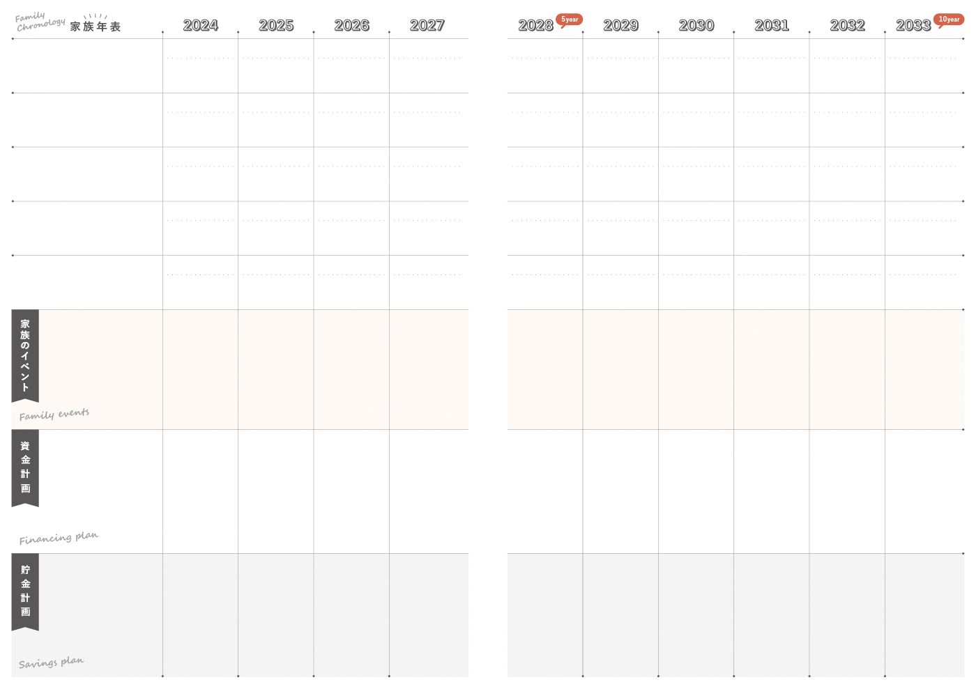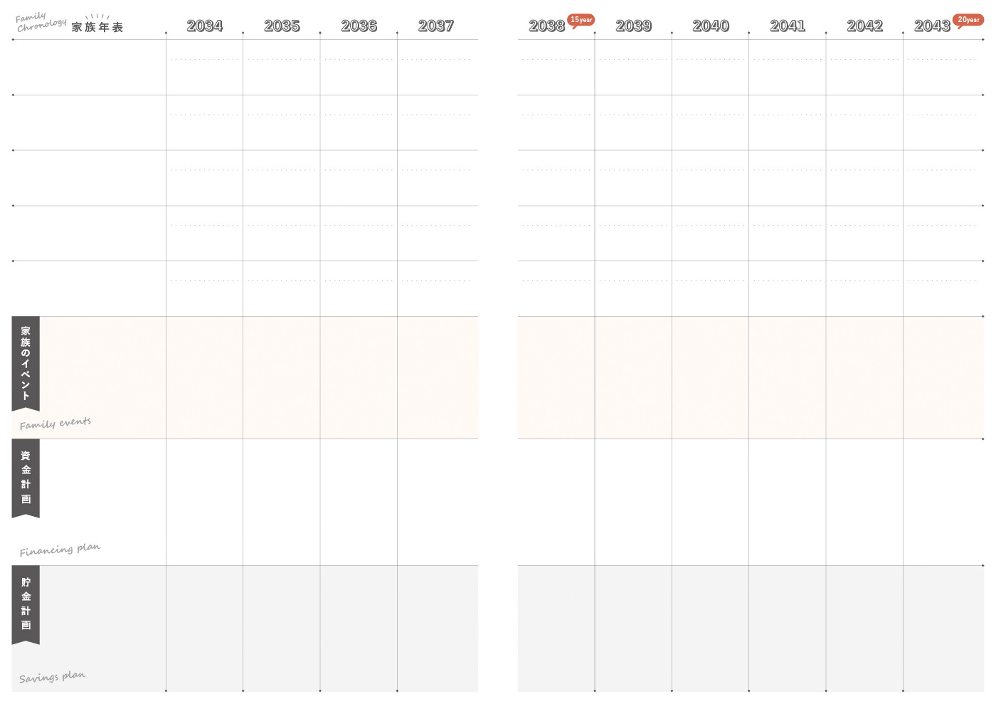 必要なお金の計画が記入できる「家族年表」ページです。