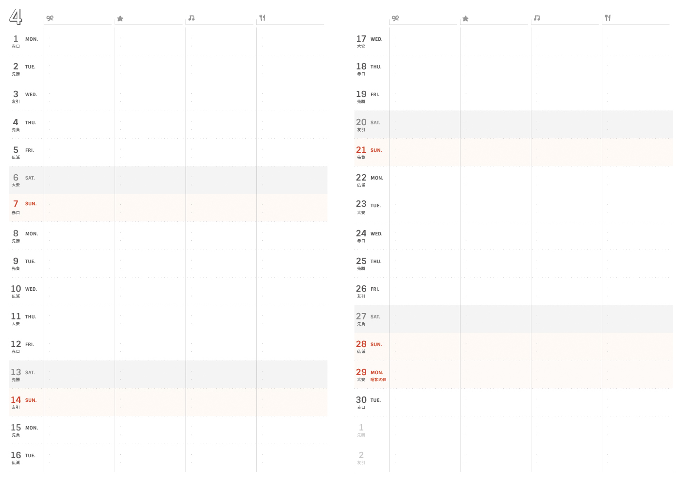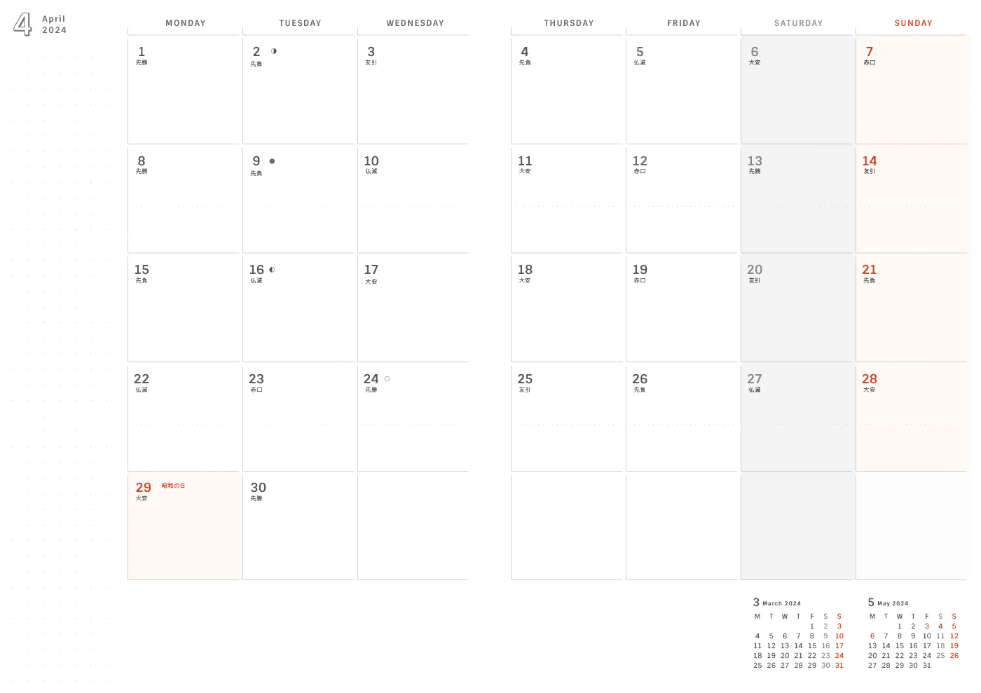 予定を組むのに便利な六曜・月齢も入れてあります。