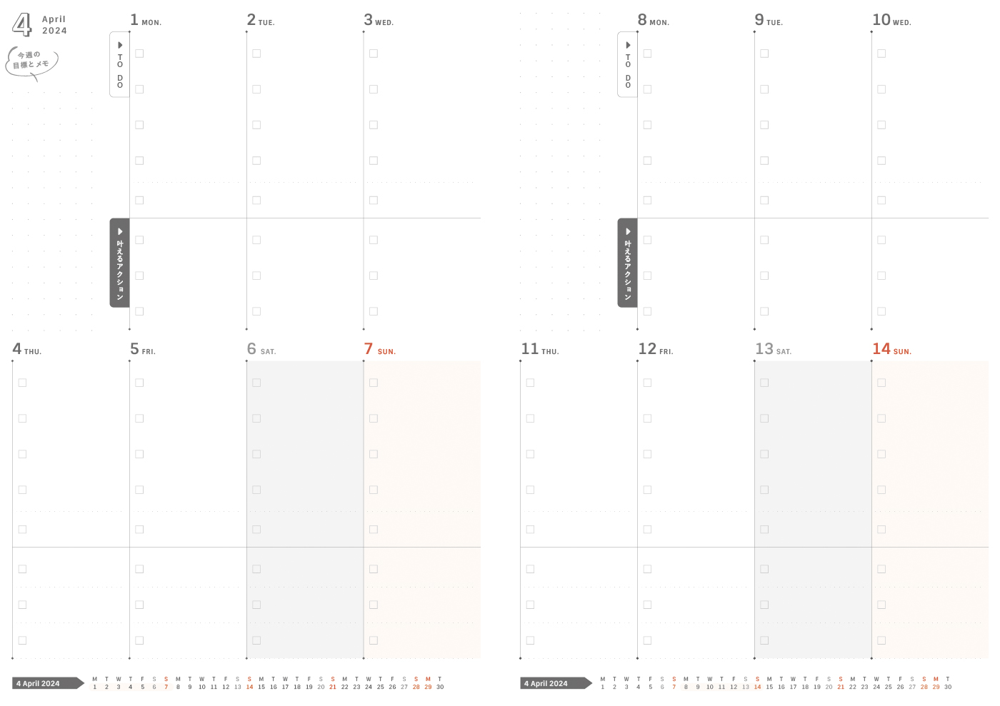 パッと見開きで1ヶ月分把握できるマンスリーページです。